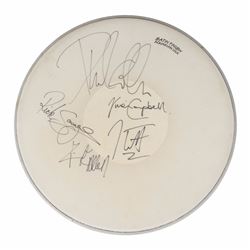 Satin finish Aquarian USA drum head, 14.5? in diameter, signed in black felt tip Joe Elliott, Phil Collen, Rick Savage, Rick Allen, and Vivian Campbel