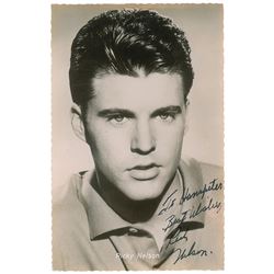 Vintage glossy 3.5 x 5.5 deckle-edge German postcard photo of a young Nelson, signed and inscribed in black ink, “To Hanspeter, Best wishes, Rick Nels