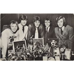 Vintage glossy 5.25 x 3.5 promotional photo of the Bee Gees proudly posing behind an array of awards, signed on the reverse in blue ballpoint, "...