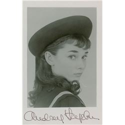 Attractive glossy 3.5 x 5.5 cardstock photo of a young Hepburn looking over her shoulder, signed in the lower border in black ink. In very fine condit