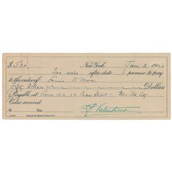 Partly-printed promissory note, 8.25 x 3.25, filled out in another hand and signed in bold green ink by Valentino, "R. Valentino," payable...