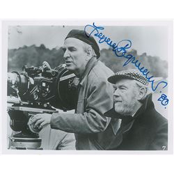 Glossy 10 x 8 photo of Bergman standing behind a camera next to famed cinematographer Sven Nykvist, signed in blue felt tip, "Ingmar Bergman, &...