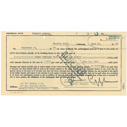 Very early DS, one page, 8.5 x 4.5, June 10, 1968. Loan document in which Coppola promises to “pay to the order of City National Bank…Three Thousand F