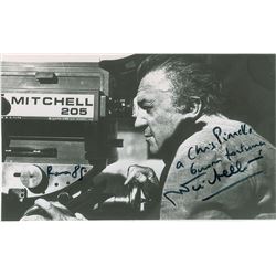 Glossy 6.25 x 3.75 photo of the influential Italian director, signed and inscribed in black felt tip, "A Chris Pinello, buona fortune, Federico...