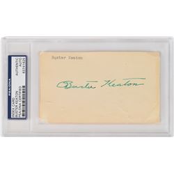 Green fountain pen signature, "Buster Keaton,” on an off-white 5 x 3 card bearing a typed collector's notation. Encapsulated in a plastic P...