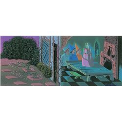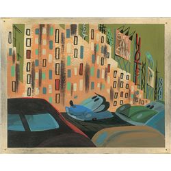 (Walt Disney Studios, circa 1970s–1980s) Original keymaster background set-up featuring Mickey Mouse, Jiminy Cricket, Donald Duck, Uncle Scrooge, and