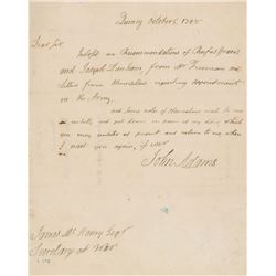 Crisply penned ALS as president, one page, 7.75 x 10, October 5, 1798. Letter to Secretary of War James McHenry. In full: "Inclosed are Recomme...