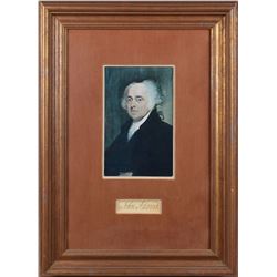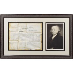 Highly sought-after large ink signature, "John Adams,” on an off-white 3.5 x 1 sheet. Double-cloth-matted and framed with a portrait to an over...
