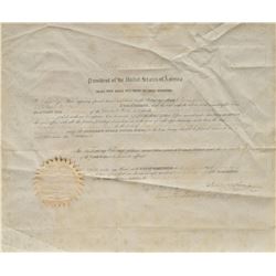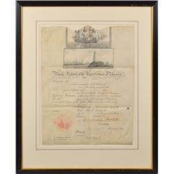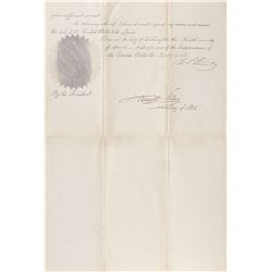 Partly-printed vellum DS as president, one page, 11.5 x 15, no date. Unissued scallop-topped ship’s pass, signed at the bottom by Jackson, and counter