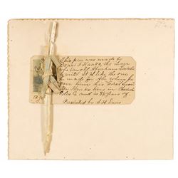 Quill pen, 5.5? long, made by Abraham Lincoln’s cousin and tutor, Dennis F. Hanks. Pen is tied with green ribbon to a 4.5 x 2 card, with a handwritten