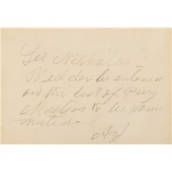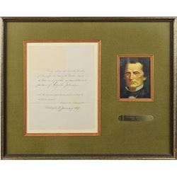 ANS as president signed “A. J.,” on an off-white 3.75 x 2.5 card, no date but 1865. Brief note to Colonel William G. Moore, in full: "Let Nicho...