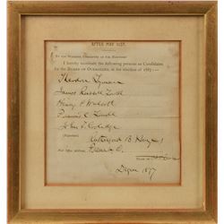 Partly-printed DS, one page, 5 x 5.25, dated 1887. Issued to the Standing Committee of the Electors, Hayes has signed and filled out a nomination form