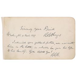 ANS as president, one page, 6.75 x 4, March 31, 1877. A warm note on an album page, in full: "Sincerely your Friend, R. B. Hayes, Washington, 3...