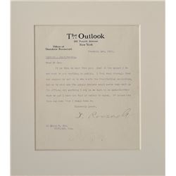 TLS signed “T. Roosevelt,” one page, 6.25 x 7.5, The Outlook letterhead, February 2, 1912. Letter to Mr. Henry W. Coe, hinting at his intention to ann
