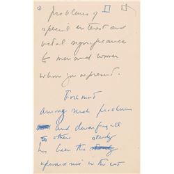 Remarkable partial handwritten manuscript draft, unsigned, 14 pages, 5 x 8, no date but circa August 1952. Fragment of an early draft for Kennedy’s sp