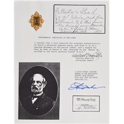 Small strand of hair belonging to Robert E. Lee, encased in a golden 1.25 x 1.75 frame affixed to the upper left corner of a certificate of authentici