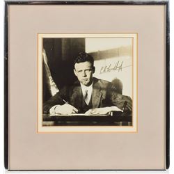 Vintage glossy 5 x 5 half-length photo of the aviator seated at his desk with pen in hand, signed in fountain pen, "C. A. Lindbergh." Doub...