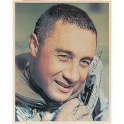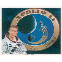 Official color 10 x 8 NASA lithograph of Roosa in his white space suit against the Apollo 14 insignia, signed and inscribed in black felt tip, "...