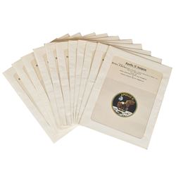 Collection of 11 swatches of Beta cloth, each featuring a 3.25? diameter Apollo 11 mission emblem, approximately measuring 7 x 6.5, individually seale