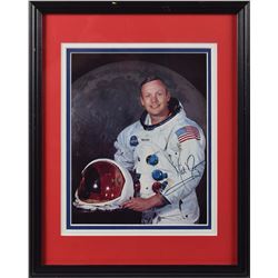 Official color 7.5 x 9.5 NASA lithograph of Armstrong in his white space suit against a lunar background, boldly signed in black felt tip. Double-matt