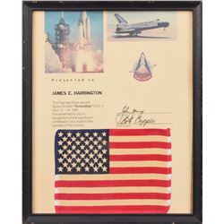 Flown fabric American flag, 5.75 x 4, flown aboard the Space Shuttle Columbia during its inaugural flight on April 12–14, 1981. Flag is affixed to a 7