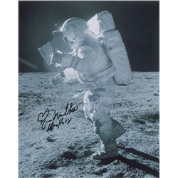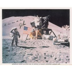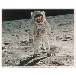 Official color 10 x 8 NASA lithograph of Aldrin posing on the surface of the moon, signed in black ink, "Edwin E. Aldrin, Jr." In very fin...