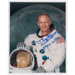 Color semi-glossy 8 x 10 photo of Aldrin posing in his white space suit against a lunar backdrop, signed in blue felt tip, “Buzz Aldrin, Apollo XI.” I