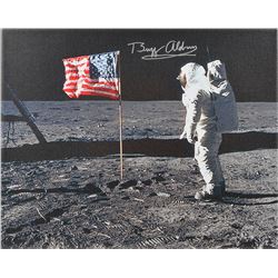 Color 20 x 16 giclee print on stretched canvas of Buzz Aldrin standing on the lunar surface next to the American flag, signed in silver ink. In fine c