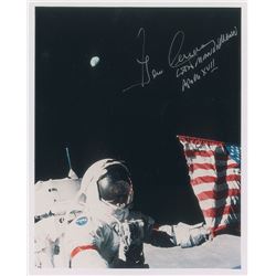 Exceptional color semi-glossy 8 x 10 photo of Cernan holding the American flag on the lunar surface, the Earth a mere speck in the distance, signed in