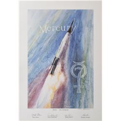 Color limited edition 21 x 29.25 lithograph of R. L. Rasmussen’s watercolor of a Mercury rocket entitled ‘Space…The Pioneers,’ numbered 254/300, signe