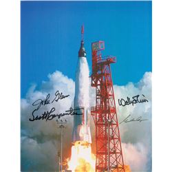 Powerful color glossy 8.5 x 11 cardstock photo of a Mercury rocket launch, signed in black ink or felt tip by John Glenn, Scott Carpenter, Wally Schir