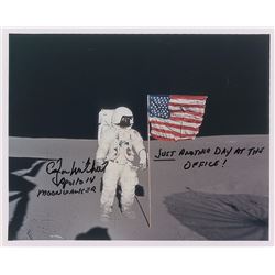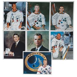 Appealing set of seven official color NASA lithographs, 8 x 10 and 10 x 8, each signed and inscribed in ink or felt tip by the moonwalker pictured, in