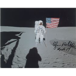 Color semi-glossy 10 x 8 full-length photo of LMP Mitchell standing next to the American flag on the lunar surface, signed in black felt tip, "...