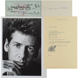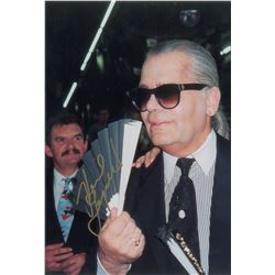 Color satin-finish 8 x 11.5 photo of Lagerfeld in his distinctive dark sunglasses, signed in gold ink. In fine condition.