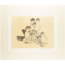 Desirable limited edition 25.75 x 20 artist's proof lithograph of a classic Rockwell sketch showing an American family with new puppies, signed ...