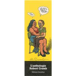 Two items signed by famed underground cartoonist Robert Crumb: a color 2.5 x 7 French language bookmark featuring artwork of Crumb sitting on the lap