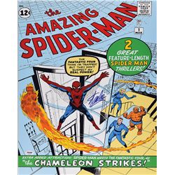 Color satin-finish 16 x 20 photo of the cover to issue No. 1 of The Amazing Spider-Man comic book, signed in blue felt tip by Stan Lee. In fine condit