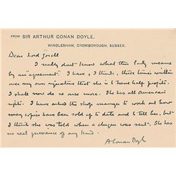 ALS signed “A. Conan Doyle,” one page, 5.25 x 3.75, personal letterhead, no date. Letter to "Lord Gorell," in part: "I really don'...