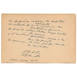 AQS on an off-white 7.5 x 5 album page, signed at the conclusion in ink, "Pablo Neruda, 1943, New York." Neruda pens the second verse of h...