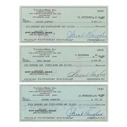 Group of three Vaughan-Reed, Inc. business checks, 7.25 x 3.25, filled out in type and signed by Sarah Vaughan, payable to her band members Andrew Sim