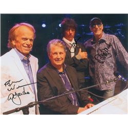 Color semi-glossy 10 x 8 photo of three Beach Boys posing with Jeff Beck on stage, signed in black felt tip by Brian Wilson, Al Jardine, David Marks,