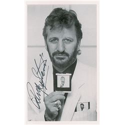 Semi-glossy 3.5 x 5.5 photo of Ringo Starr holding a photo of himself holding a photo, with a second photo peeking out from his front pocket, signed i