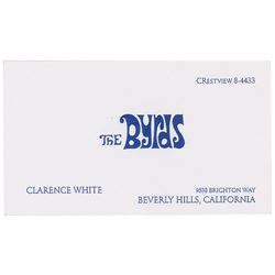 Scarce The Byrds business card belonging to Clarence White, 3.5 x 2, with lower portion listing White's name and address. In very fine condition.