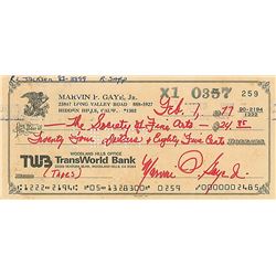 Personal check, 6 x 2.75, filled out and signed by Gaye, "Marvin P. Gaye, Jr.," payable to The Society of Fine Arts for $24.85, February 1...