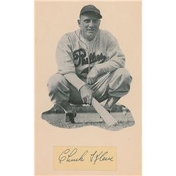 Vintage fountain pen signature, "Chuck Klein,” on an off-white 2 x .75 card, affixed to a larger card bearing an affixed magazine photo of the ...
