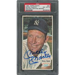 1964 Topps Giants #25 Mickey Mantle baseball card featuring a close-up portrait of the New York Yankees icon, signed in blue felt tip. Encapsulated an