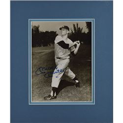 Glossy 7 x 9.25 photo of Mickey Mantle taking a mighty swing in his Yankees uniform, signed in blue felt tip. Double-matted to an overall size of 12 x