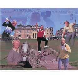 Color satin-finish 10 x 8 photo collage of Jack Nicklaus celebrating tourney championships over the course of his golfing career, signed in black felt