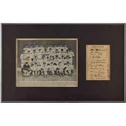 Vintage fountain pen signatures of 16 members of the 1934 New York Giants team on an off-white 3.75 x 5.5 card, including: Mel Ott, Carl Hubbell, Trav