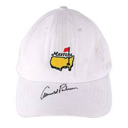 Very desirable white Masters Tournament cap with adjustable belt strap, signed on the brim in black felt tip by four-time tourney winner Arnold Palmer